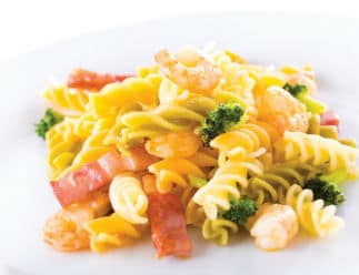 FUSILLI COM MIOLO DE CAMARÃO, BACON E BRÓCOLOS